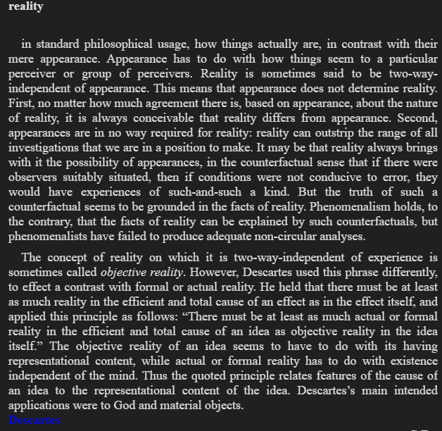 Déf. réel : « qui existe indépendamment de ce que l’on en pense, décrit/exprime et conceptualise. »