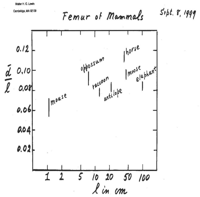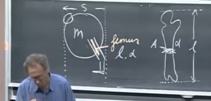 Lewin expose une hypothèse de Galilée selon laquelle les animaux ont une taille limitée car ils ne pourraient avoir de fémur supportant leur poids à partir d’une certaine taille.