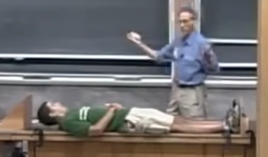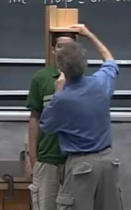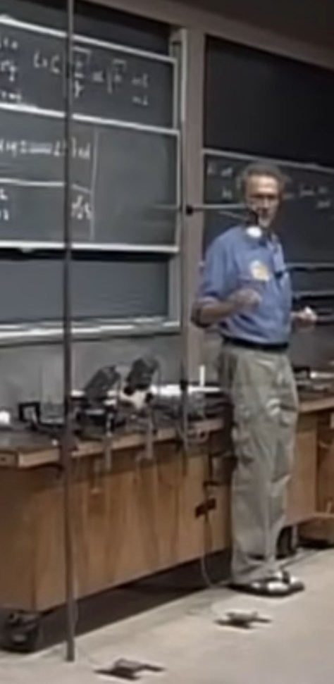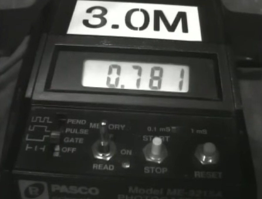 Lewin teste expérimentalement une prédiction avec deux dispositif d’hauteurs différentes qui chronomètrent précisément la chute d’un objet : le chronomètre démarre lorsque l’objet est relâché, et s’arrête lorsque l’objet touche un capteur sensible au sol.
